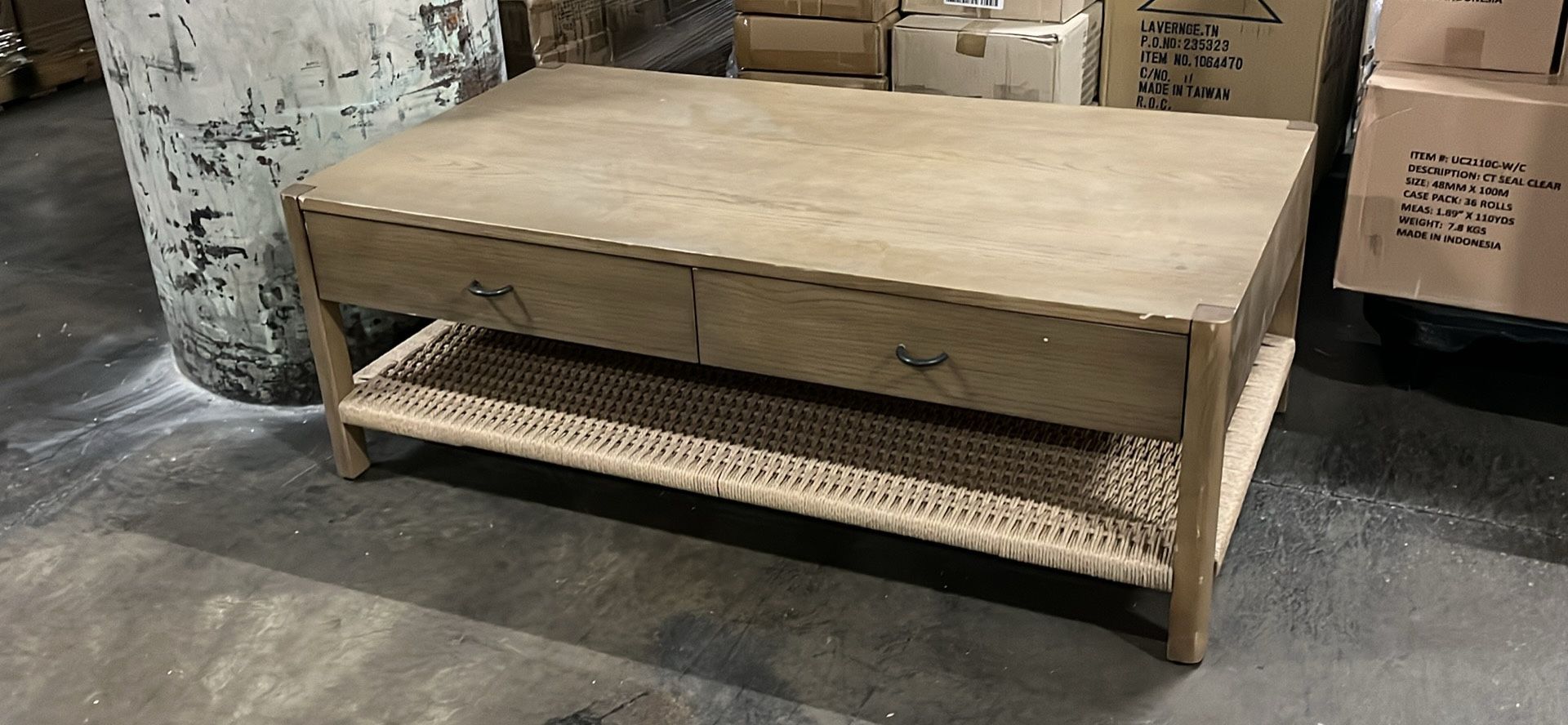 This is actually a new table but has suffered some dings while stored in a warehouse. Needs a cleaning Original retail price $1,200! 17 inches high x 48 inches wide x 26 inches deep Clearance from floor: 4 inches; Distance between legs (front to back): 23 inches; Distance between legs (side to side): 45 inches; Tabletop: 0.75 inches thick Constructed from solid ash wood, iron and paper cord