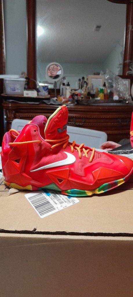 Nike, Lebron James Tennis Shoes, Orange, white, multi colored bottom heal, orange shoe strings. Official lebron signature under the bottom. Very cute and stylish. Show up and show out.