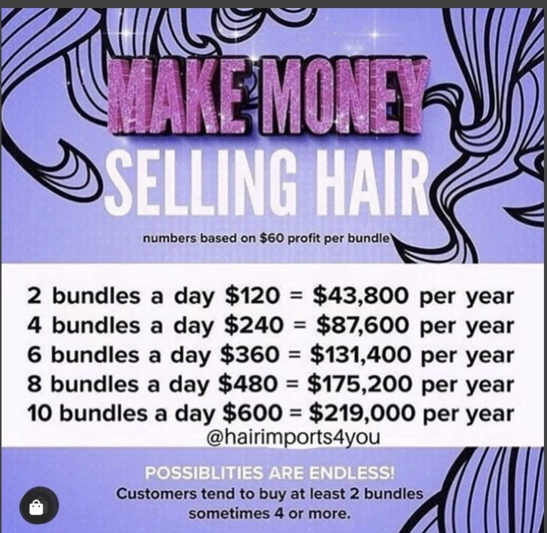 5pks of 10 5pks of 12 5pks of 14 5pks of 16 5pks of 18 For 25 packs of virgin human hair For 600 Set your prices and start your dream.