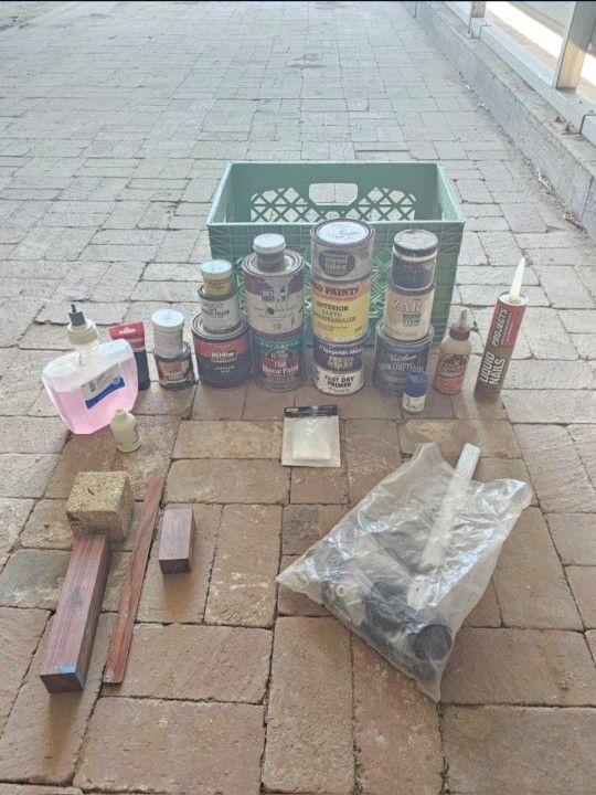 Large box of various wood stains, paints, primers, and glues. This kit was used for a wood project but is no longer needed, lots of barely used cans. Also includes a set of wheels and hinges to install on a project. I am flexible make me an offer 👍 Hablo español!