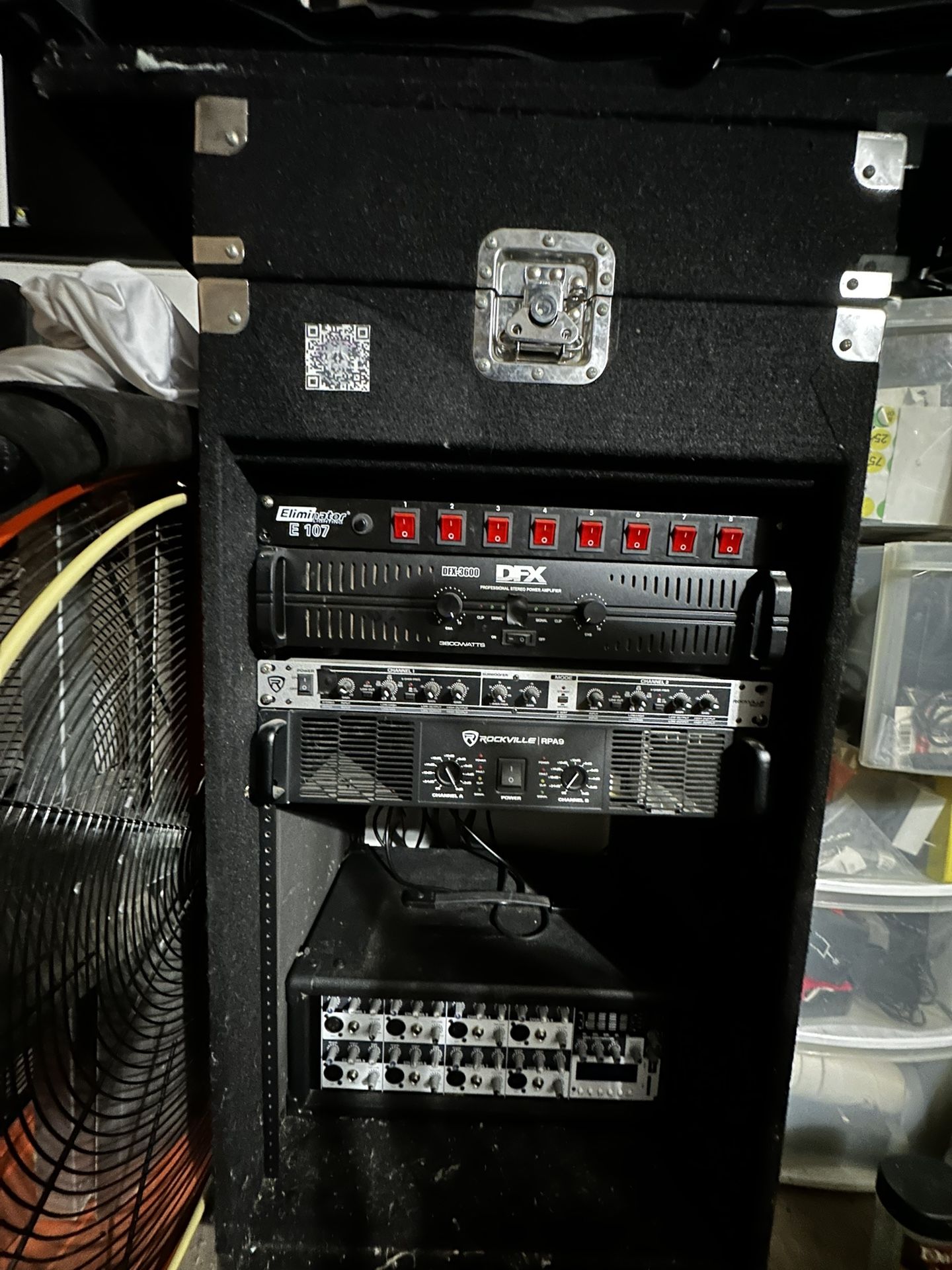 Two 2 15in speakers and 2 18in subwoofers, 2 amps, a mixer that has bluetooh,a crossover for subs,all speaker wires and cabinet, really loud system can test before you buy, asking $2000 obo