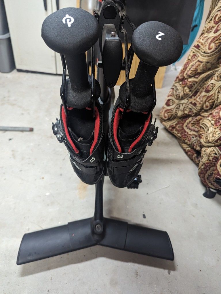 Peloton comes with: Peloton floor mat Peloton weights (2lbs) Peloton shoes (7m) Wood base Earphones Heart monitor