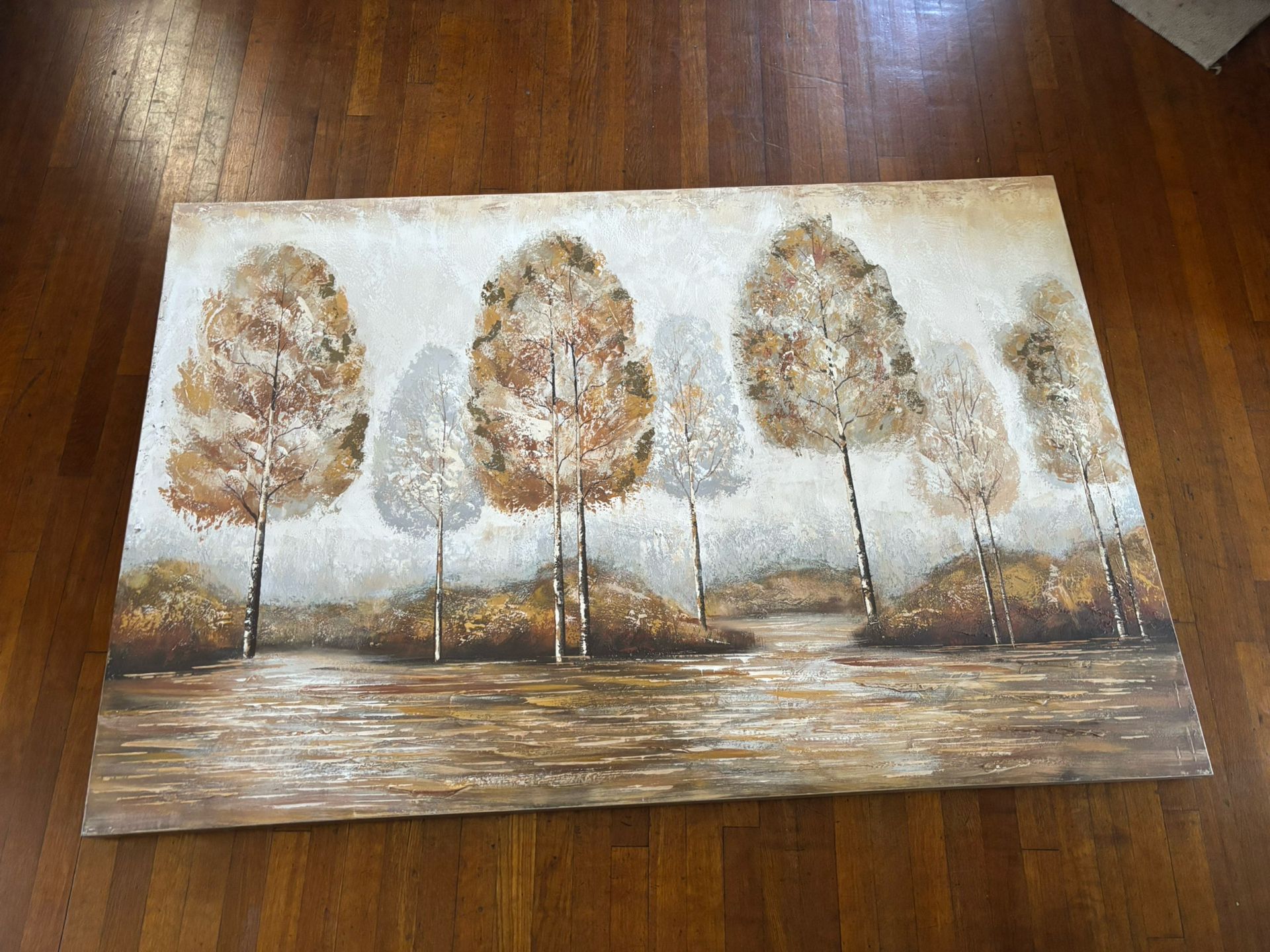 Exlarge canvas artwork for a large room 60wX40L . Very large and is very light wieght , has wore on back to hange in super good condition . Tones of tan , Biege , white and brown . Also nice for an office. Pickup cash only . Lower price to $30