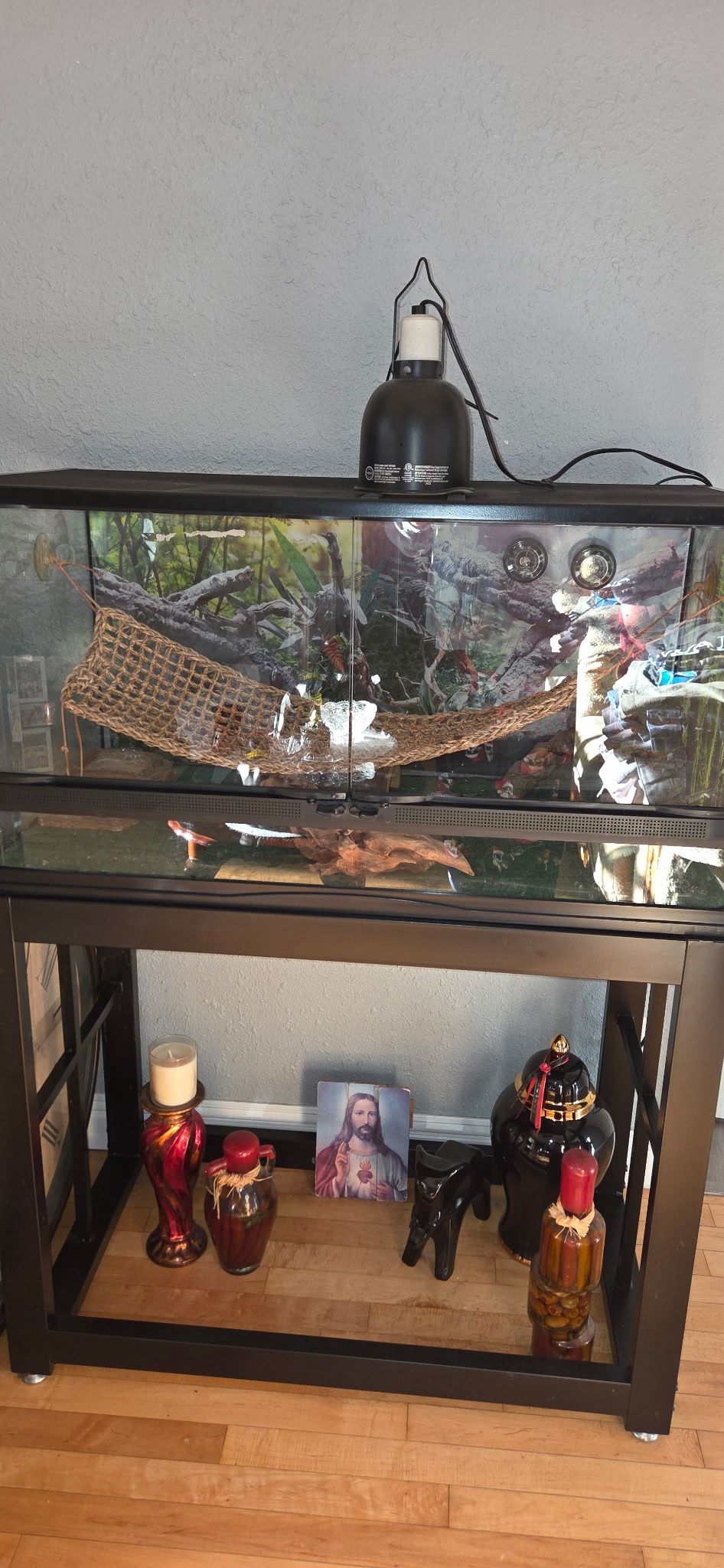 Reptile tank with stand everything included no reptile. L- 36 inch H- 19 inch W- 19 inch.