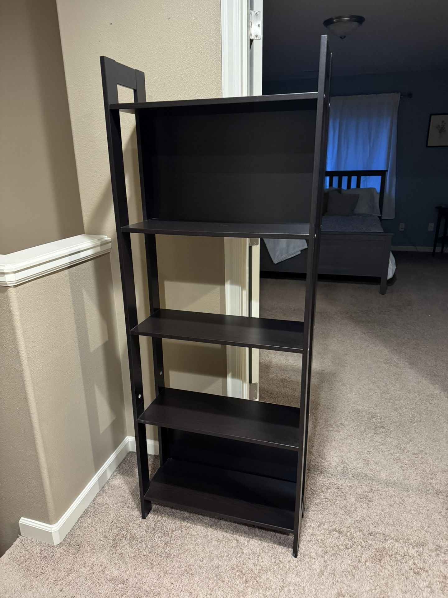 Clean, modern shelving unit in matte black. Solid, stable construction with a vertical open-frame design that works well in living rooms, offices, bedrooms, or as a stylish storage solution. Neutral and versatile, it fits seamlessly into contemporary or minimalist spaces. Details • Color: Black • Multiple open shelves plus lower storage section • Sturdy and well-balanced • Clean lines, modern profile • Fully assembled and ready for pickup Condition Very good condition. No structural issues. Minor, normal wear consistent with light use. Approximately 5.5 ft x 2 ft Ideal for Books, decor, plants, office storage, or media accessories. Price $50 OBO Local pickup only. Cash preferred. Serious inquiries only.