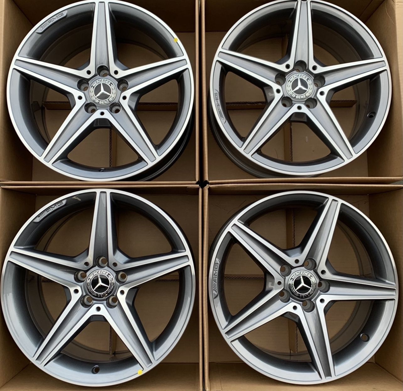 BRAND NEW GREG / SILVER 18” Mercedes Benz AMG Factory OEM Wheels Rims All (4) for only $950 vs Mercedes Benz Dealer MSRP $2,798 This is a new set (qty 4) Mercedes Benz AMG Factory OEM Wheels Rims w/ center caps Size: 18x8.5" square Bolt Pattern: 5x112mm Center Bore: 66.6mm Offset: ET 49mm Included: 4 rims and 4 center caps This wheel spec is compatible with the following years and models (Buyer to verify) E-CLASS 2010~2016 Models : E 250, E 300, E 350, E 400, E 500 * doesn't fit AMG packages with large brake calipers (E55, E63 etc)