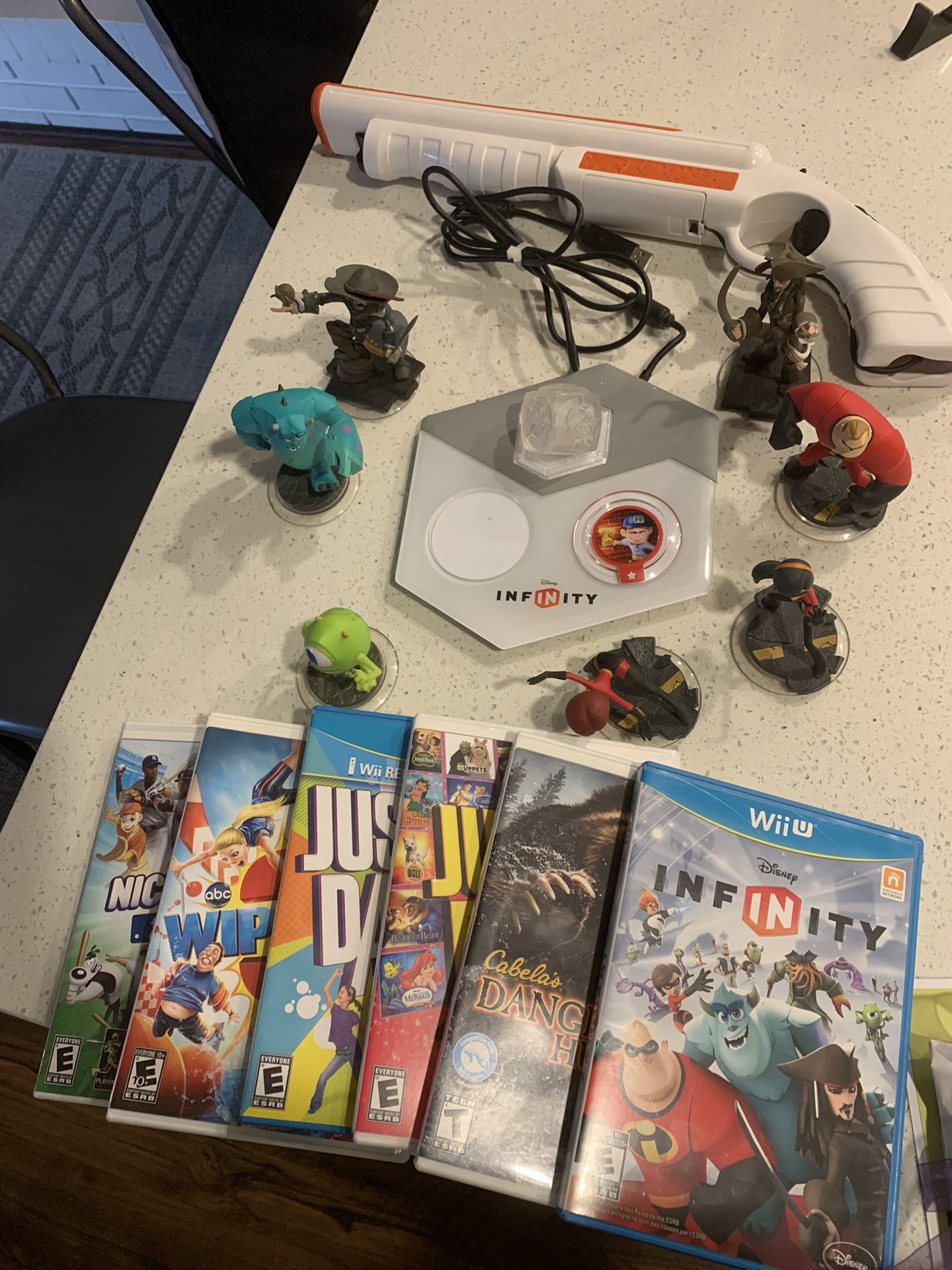 Games: ($5 ea) Infinity Cabelas dangerous hunts 2013 Just dance Disney party Just dance kids 2014 Wipeout Nick toons MLB 7 characters with character stand($5 each or $25 for all) Extra hand control ($5) Shotgun ($10)