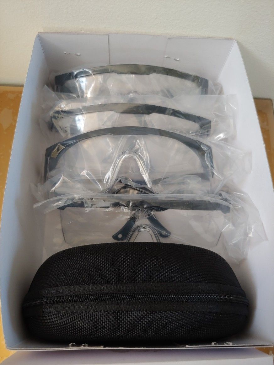 Safety Goggles for Protection, Protective Eyewear over Eyeglasses PPE Eye Protection with Side Аdjustable Temples Anti-Fog Proof Anti-Scratch Protection for Work Lab Men Women 4-packs Set Fits most glasses - with a spacious "view"-zone with a height of 2.16in the eye area and an internal width of 5.51in fits easily over most reading glasses and protects your eyes and glasses from pollen, saliva and dust. Tested! Perfect comfort when wearing - thanks to the soft and individually adjustable temples in 3 positions, the glasses fit comfortably on the nose and ears without slipping or causing pressure. Tested! High scratch protection and Anti-Fog coating - special coating makes glasses resistant to scratches on the outside and fogging on the inside ... And clear lenses protect your eyes from harmful UV rays Very suitable for crowded places, especially for nurses and dentists, but also for DIY projects, carpentry, shooting, gardening or even for cutting onions. BRAND NEW Retail price $18.99 + tax PRICE IS FIRM