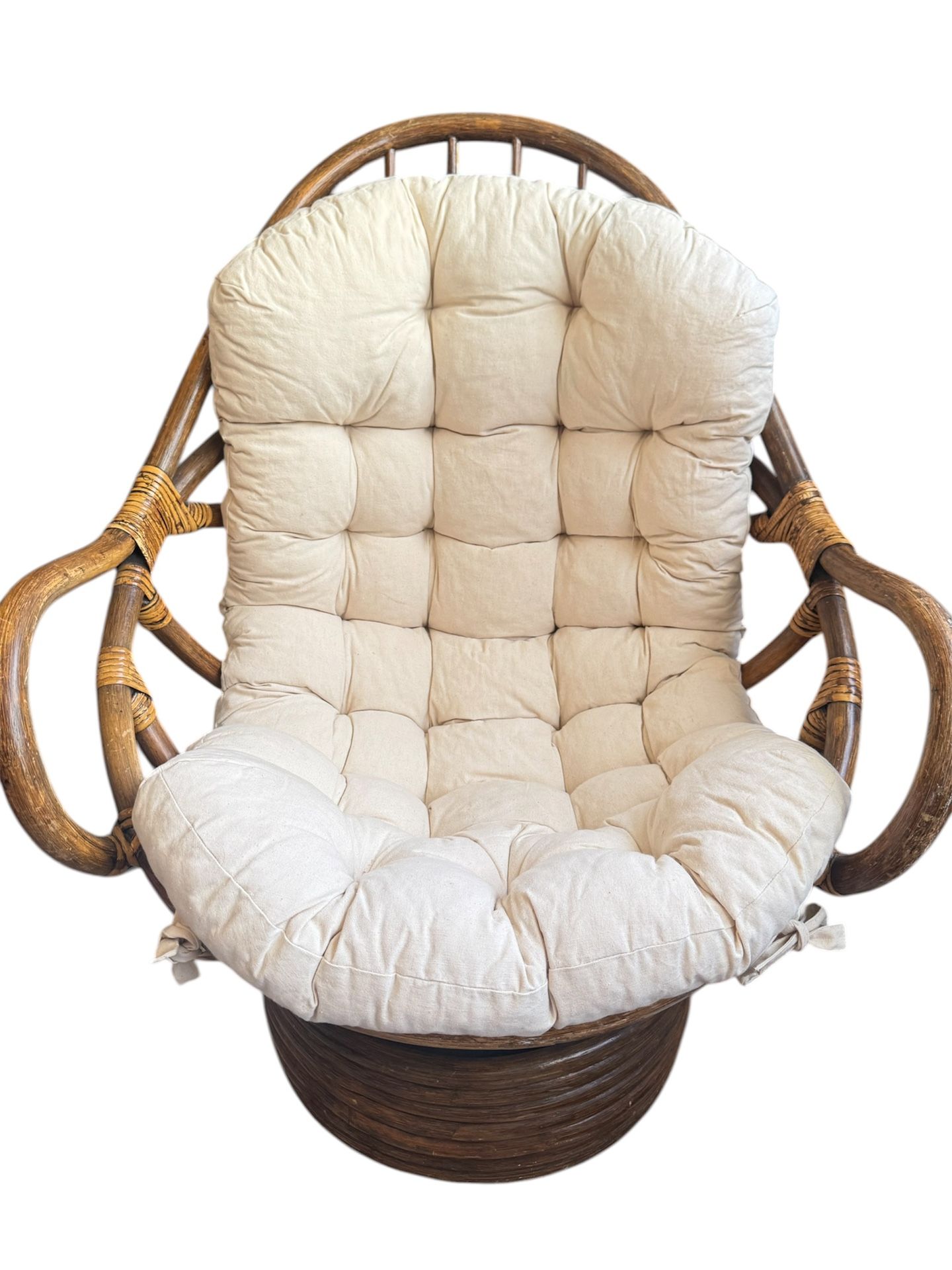 Vintage ORIGINAL 70’s Swivel Rocking Bamboo Rattan MCM Lounge Chair w. Chic Linen Cushion