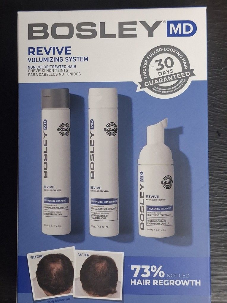 Description: BosleyMD Revive Volumizing System for non color-treated hair. This 3-piece set is designed to help hair appear thicker, fuller, and more voluminous with consistent use. Includes: • Revive Nourishing Shampoo (5.1 fl oz) • Revive Volumizing Conditioner (5.1 fl oz) • Revive Thickening Treatment (3.4 fl oz) Features: • Lightweight volumizing formula • Helps reduce the look of thinning hair • DHT-blocking complex (as stated on packaging) • Suitable for daily use • For non color-treated hair Great option for anyone looking to improve the look of fullness, body, and manageability. Notes: Packaging may show light shelf wear. Please review photos for exact item condition. Item sold as pictured. Local pickup or shipping available.