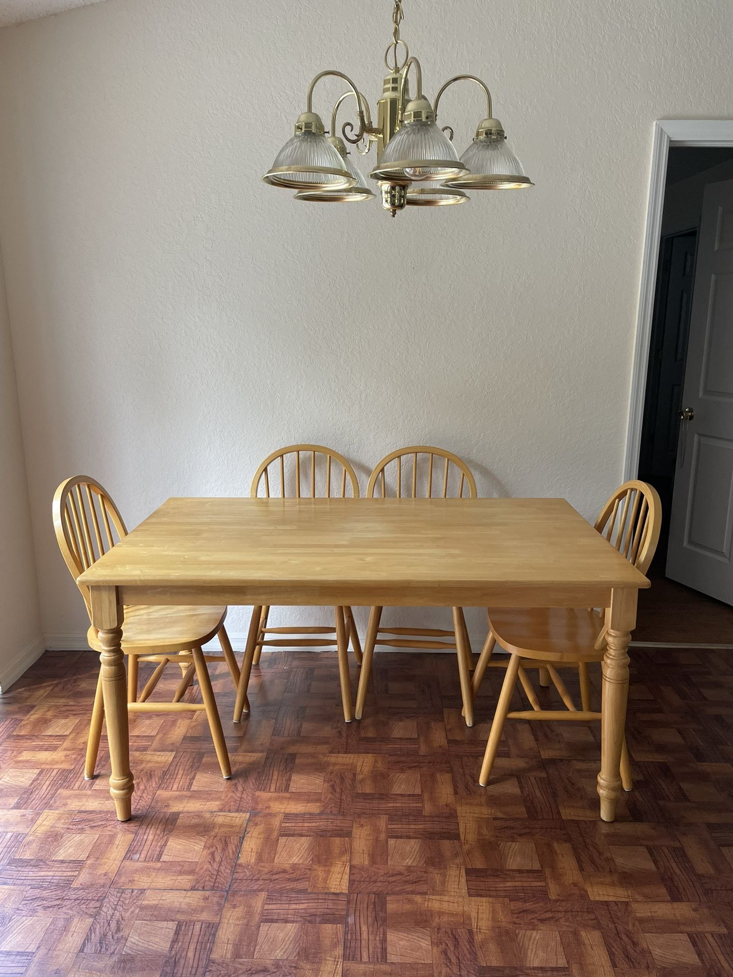 Solid wood dining room table with 4 chairs. All chairs have felt sliders on the bottom of the legs. Used in really good condition. 5 feet long by 3 feet wide. 36W x 60L Table can seat 6 $200 OBO One chair has a little nick and has been repaired. See pictures. Cleaned and sanitized.
