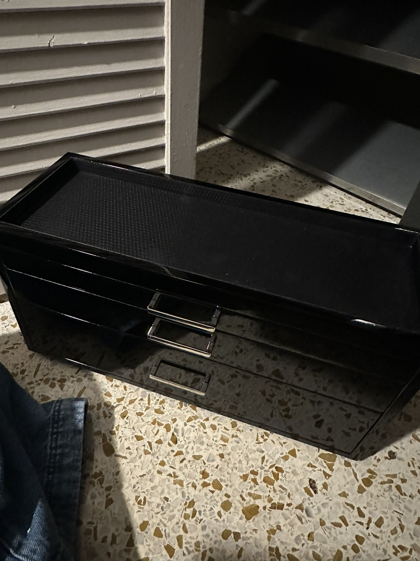 Storage box for jewelry or watches. Black exterior Suede like interior Fits inside a safety box. 3 drawers