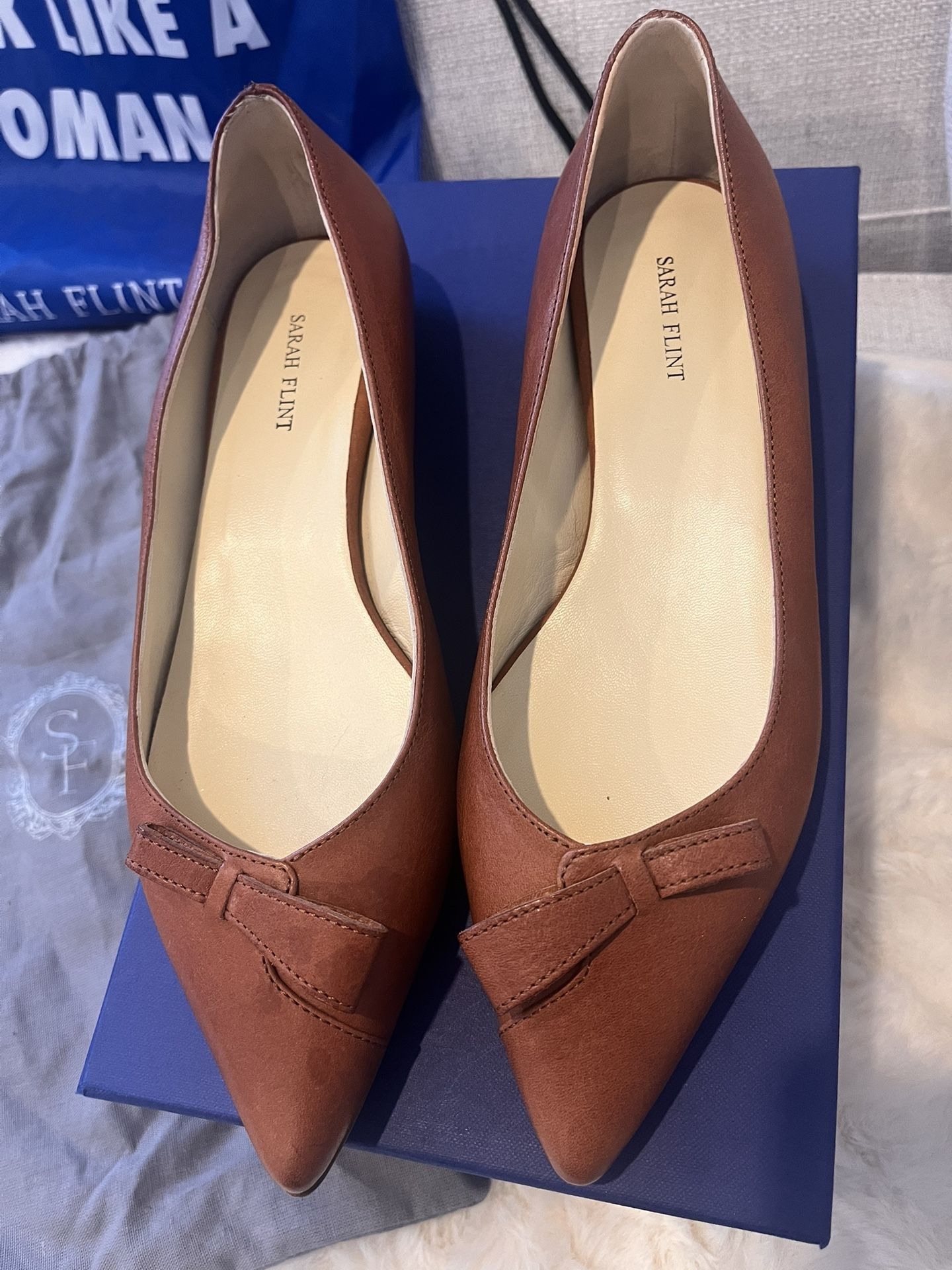 Sarah Flint’s pointed-toe Natalie flat in saddle vachetta, topped with the Sarah Flint signature asymmetric bow. Elegant, effortless, and comfortable, this is the shoe you'll wear with everything. Fits true to size. Sarah Flint size guide: 38.5 = 8 - 8.5 • 10mm Pointed Toe Flat • Asymmetrical bow detail: The unique bow is a fun and feminine detail • Handcrafted in Italy • 3mm of extra padding added for extra comfort (Leather lining and insole) • Refined vamp that reveals just the right amount of toe cleavage • Leather outsole with full rubber forepart to prevent slipping • Vegetable-tanned calf leather upper