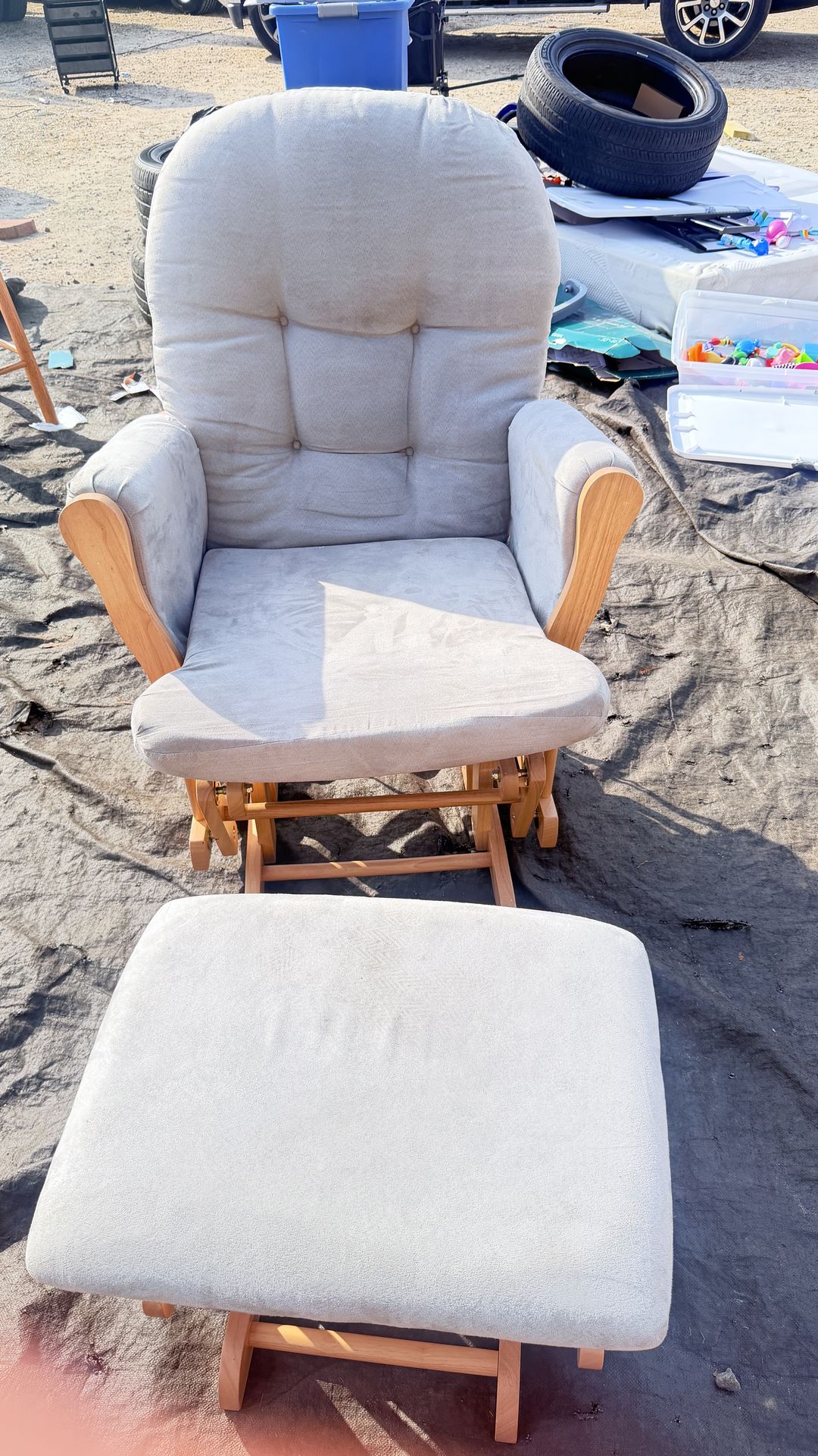 Beautiful glider rocking chair with matching ottoman for sale. Perfect for a living room, nursery, reading corner, or just relaxing after a long day. ✅ Smooth and quiet gliding motion ✅ Very comfortable cushions ✅ Matching ottoman included ✅ Strong wooden frame ✅ In very good condition Great for a nursery, nursing chair, living room, or reading space 📍 Local pickup If you’re interested, send me a message. First come, first served! ✨ Very comfortable and ready to use.