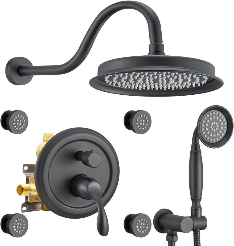 DASAN Antique Shower Faucet Sets Complete Rain Shower System In Wall With Body Shower Spray Jets, Matte Black Shower Fixtures With 9’’ Rainfall Overhead Shower, Handheld, Valve & Trim Kit, AT249W-MB