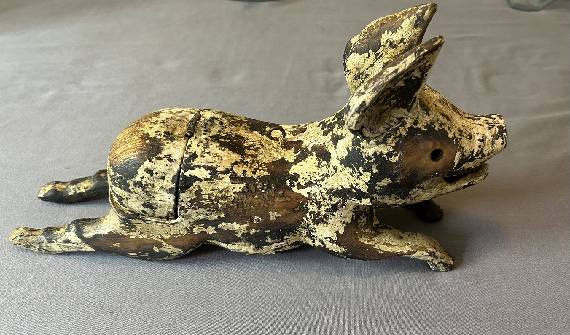 This carved wooden pig is made by Christopher Blake, an American folk artist based in Minnesota. This piece is titled when pigs fly. Very rare find…. this pig measures approximately 14 inches in length and 7 inches in height