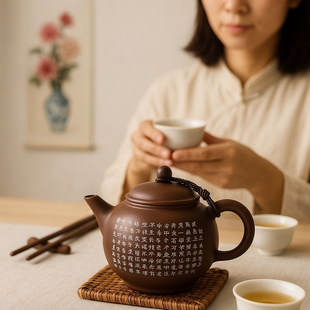 Chinese 1990s Yixing Purple Clay Teapot Heart Sutra Lid With Cord, 3.5x2” SHIPPING IS AVAILABLE PLEASE NOTE: The first image is an artistic representation; all other photos and the video show the actual item. Pictures are part of the description, please check them & let me know if you require additional ones. Pristine condition. Appears unused with no cracks, chips, repairs, or surface wear. This small purple clay teapot is a traditional Yixing-style zisha teaware and features engraved Heart Sutra calligraphy across the body. The compact form is suitable for gongfu-style tea preparation or display as a tea culture object. The braided cord attached to the lid functions as a lid retainer to prevent accidental drops during pouring. Fascinating Fun Facts: • The calligraphy is based on the Heart Sutra (般若波羅蜜多心經), a foundational Buddhist text emphasizing impermanence and mindfulness, commonly used on tea and scholar objects. • Yixing-style purple clay teapots are valued for their porous clay body, traditionally believed to enhance tea flavor over time. Dimensions: 3.5 x 2 in Weight: 6 oz Capacity: approx. 200 ml Love more than one item from my store? Feel free to message me—I’m always happy to combine shipping or create a custom bundle just for you.