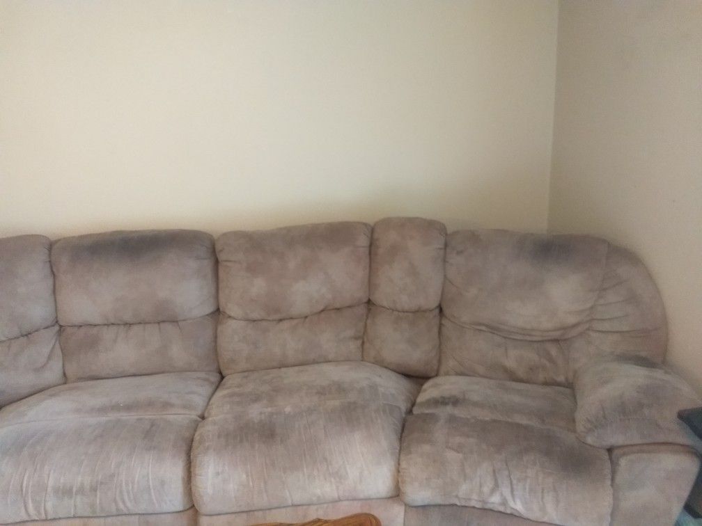 Tan microfiber recliner on each end and cup holders. It comes from pet friendly and kid friendly home. Both recliners work but one side needs the foot rest sewn.