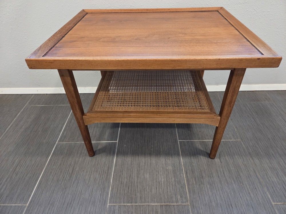 Beautiful mid Century Drexel Declaration end table in good condition. The table is a medium tone Walnut and the cane shelf is in excellent shape. 27 x 22 x 20 inches. Free delivery to the Seattle area.
