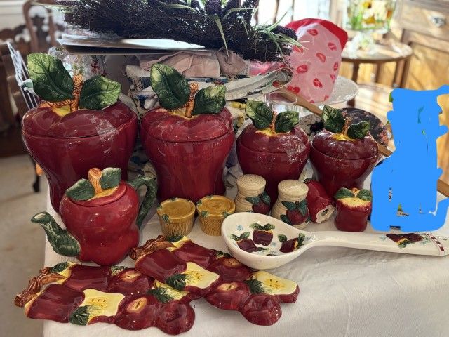 4 apple canisters, 3 sets of salt and pepper sets, spoon rest, 2 wall decor and apple tea pot.