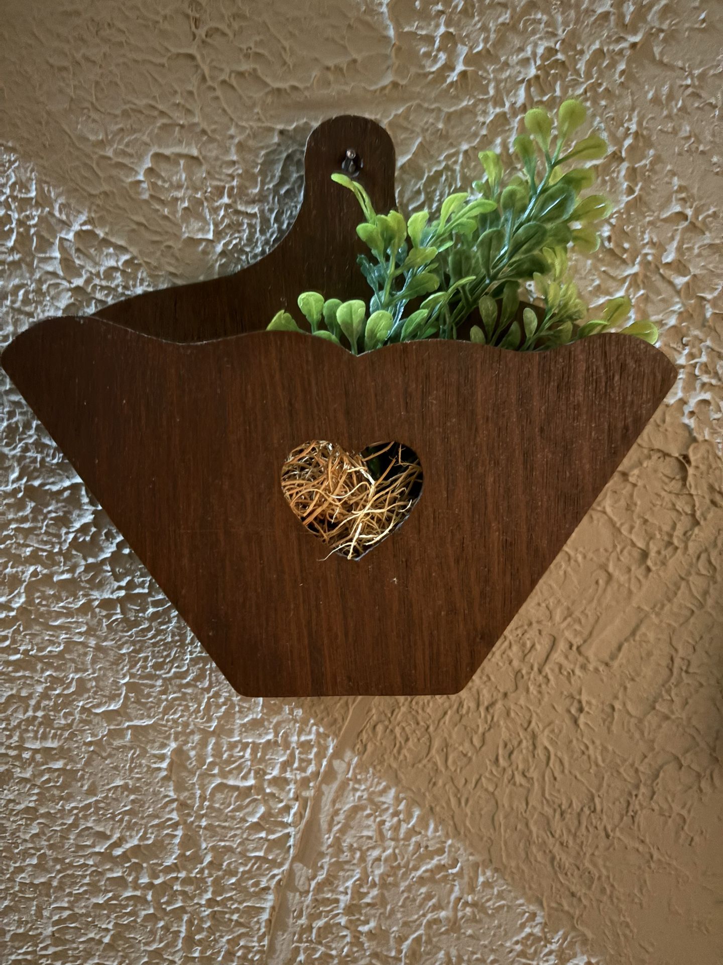 Wall pocket with heart cutout is lightweight for easy hanging. It measures approximately 7” tall, 7 1/2” wide and 1 1/8” deep. Greenery included if desired. $2 cash