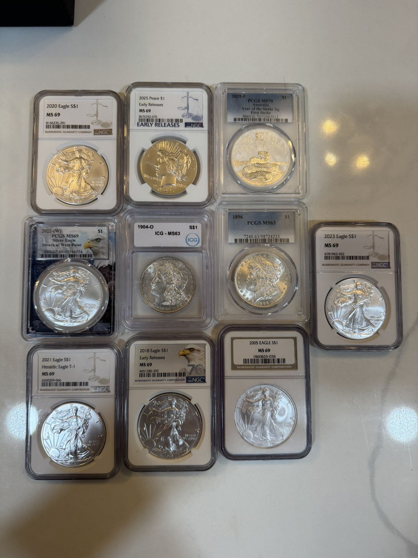 2025 PCGS mS70 Australia snake 2020 NGC ms69 silver Eagle 2025 ms69 peace dollar NGC 2022 PCGS ms69 silver Eagle 1904 Morgan dollar ms63 ICG 1896 PCGS Morgan dollar ms63 2021 Eagle ms69 2018 Eagle NGC ms69 2023 Eagle ms69 NGC 2005 ms69 NGC Eagle