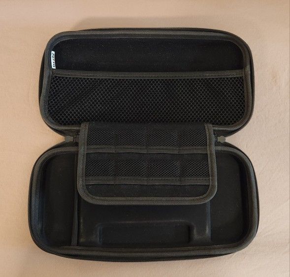 Hardshell zipper case. Holds 8 games