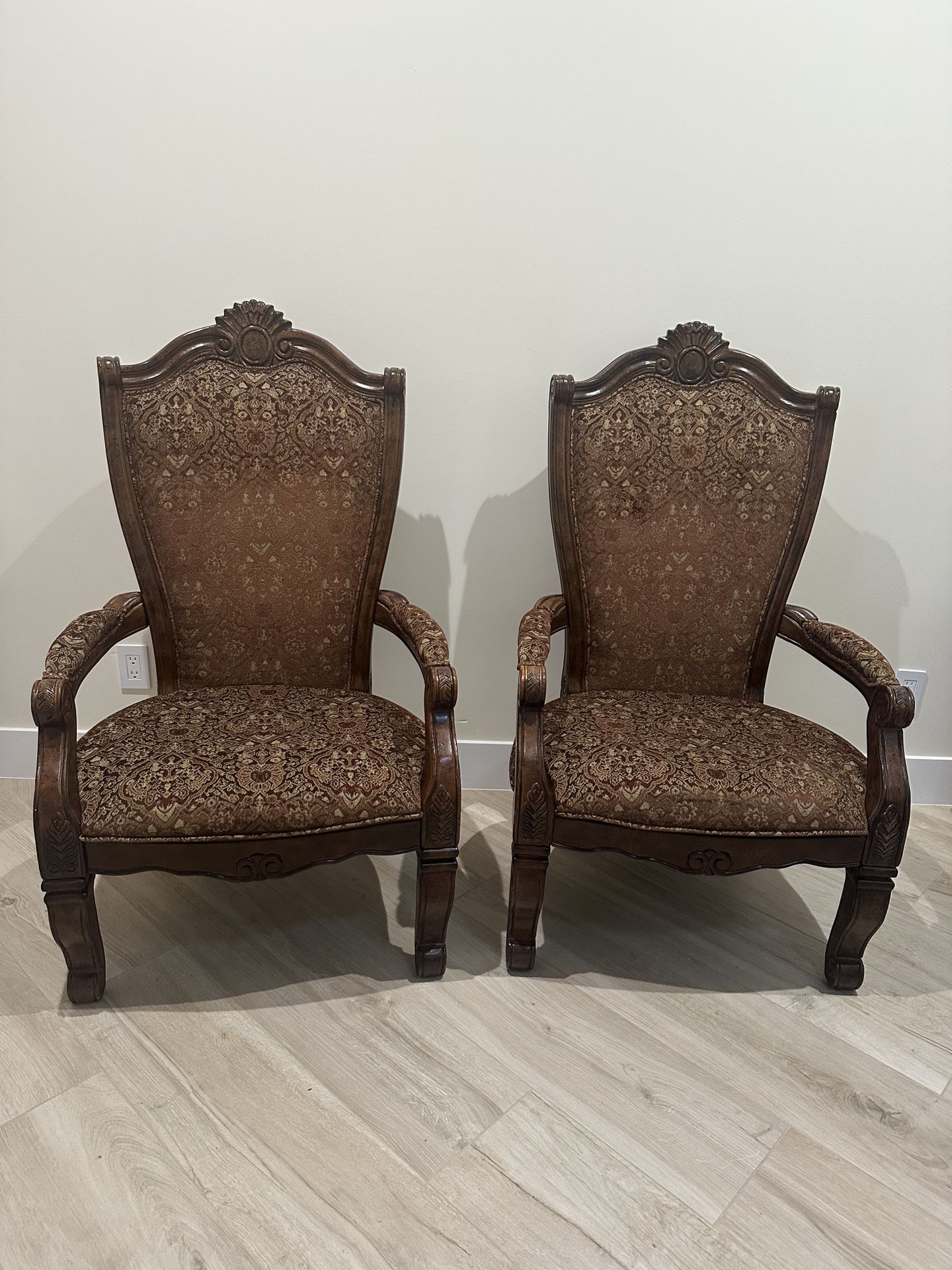 $50 Two beautiful large chairs Can be used as accent, dining, or office chairs Color is like a red burgundy with gold Last picture has measurements Recently bought from facebook marketplace and did not work for the space I needed them. Paid $50 plus a 40 minute drive. The chairs are in good shape and beautiful. Cross streets for pick up -14st and Baseline Rd