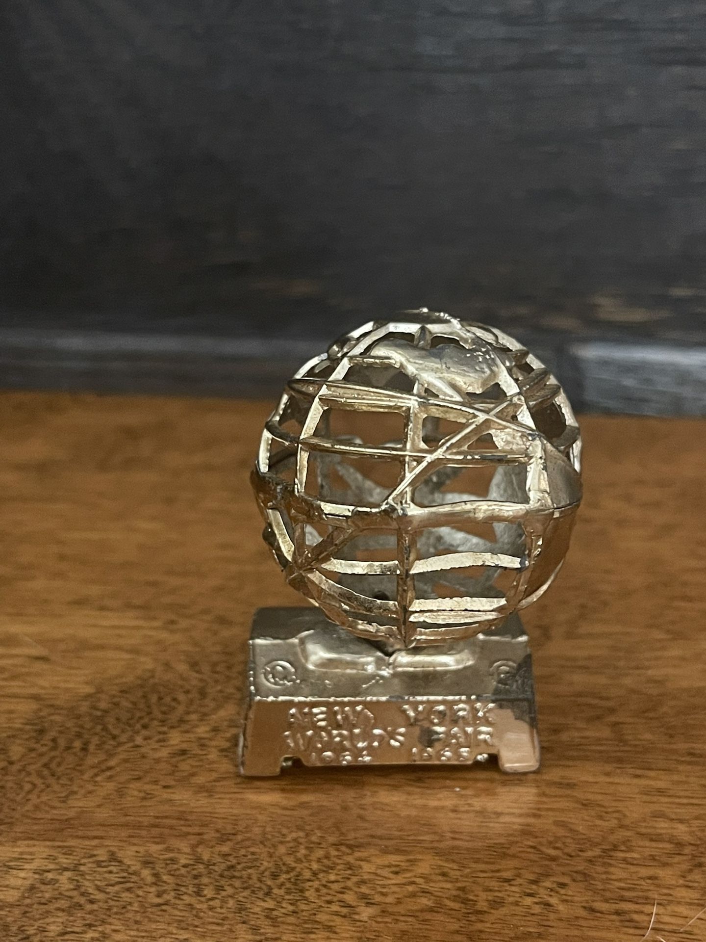 Vintage souvenir from the New York World Fair in 1964-65. This gold tone pencil sharpener features a 3D model of the unisphere. Please see pictures for condition.