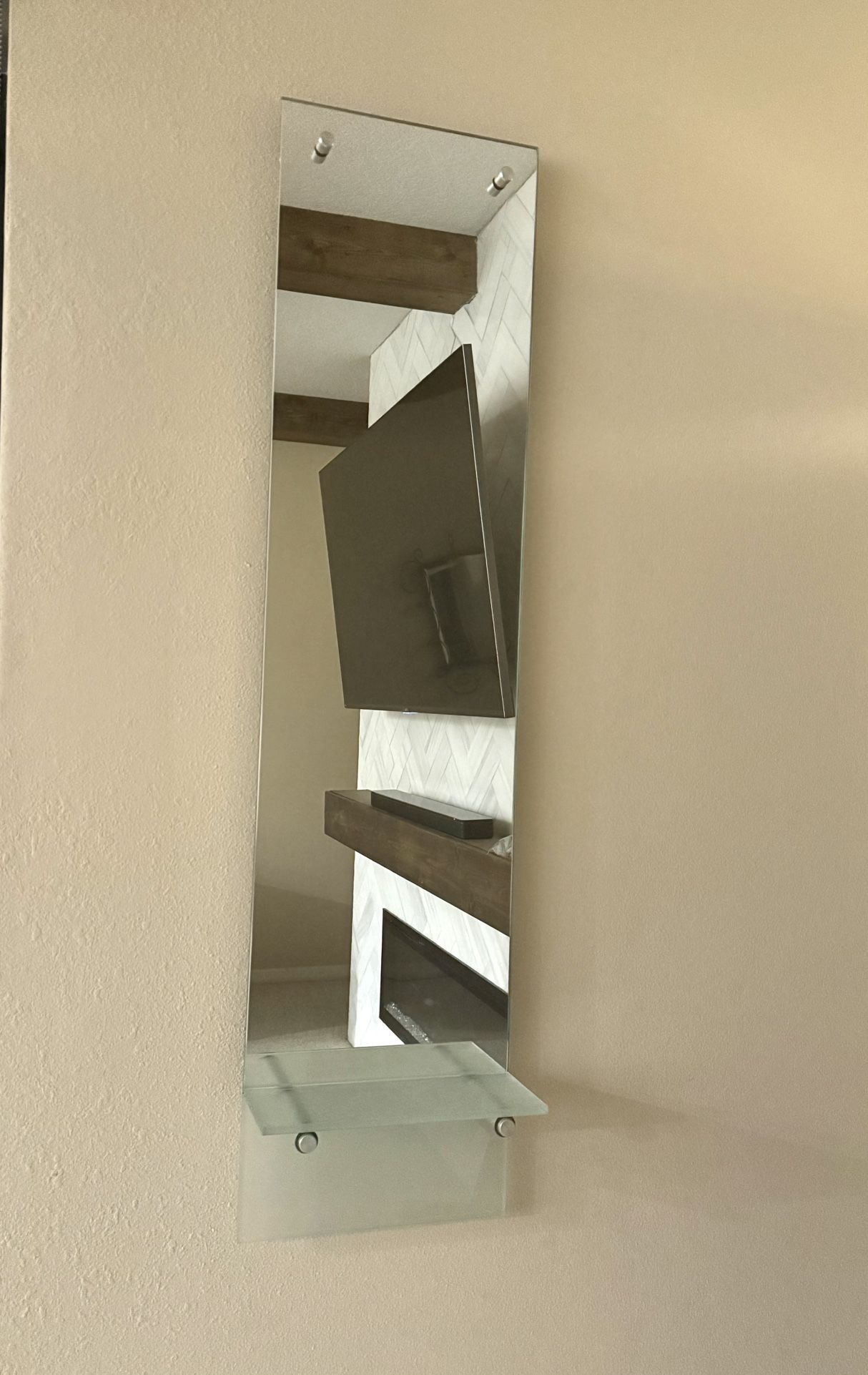 Sleek & Functional Design Upgrade your space with this stylish wall mirror featuring a built-in frosted glass shelf. Perfect for entryways, bathrooms, or bedrooms, this piece combines minimalist design with everyday practicality. Features: • Rectangular vertical mirror with clean lines and modern mounting clips • Frosted glass shelf supported by sturdy metal brackets – ideal for small décor, toiletries, or keys • Reflects light beautifully to open up any room • Easy to install and space-saving Approximate Dimensions: • Mirror: 24” H x 16” W • Shelf: 16” W x 4” D