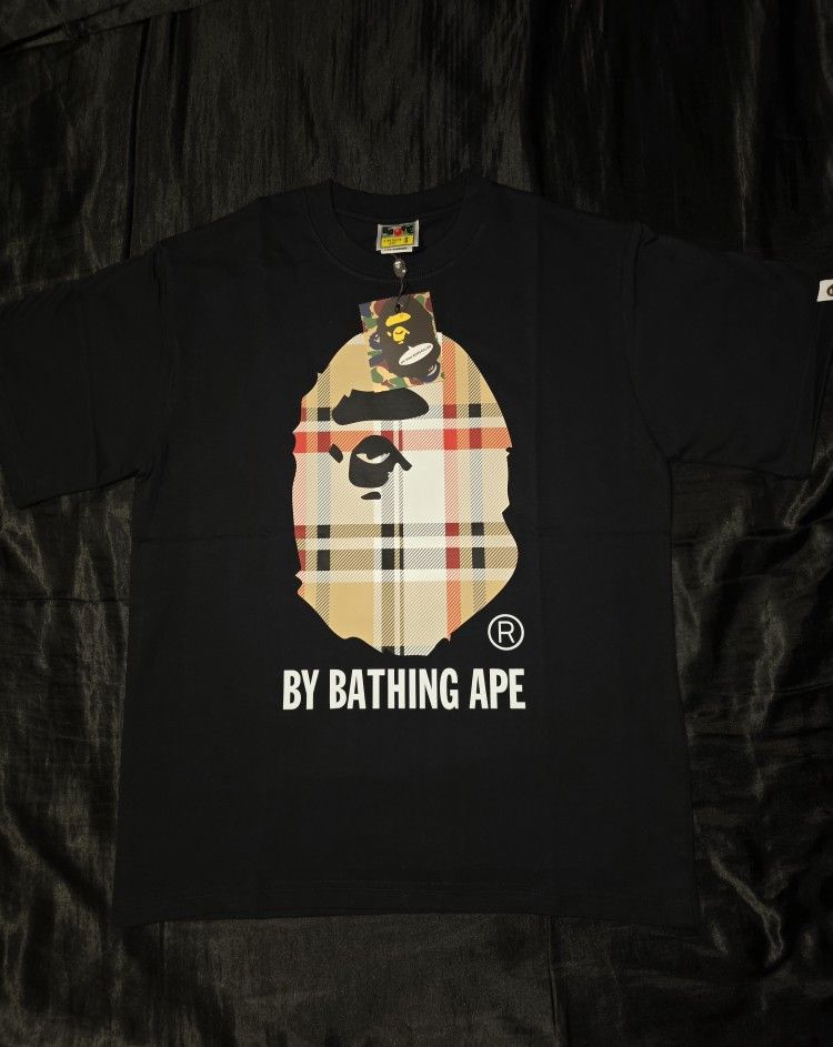 OFFER ME! BRAND NEW WITH TAGS & BAGS! I HAVE MULTIPLE IN EACH SIZE! The Bape x Burberry Check Ape Head T-Shirt in black is a stylish and versatile piece for men. Made from cotton with a regular fit and short sleeves, this tee features a classic crew neckline and a striking ape head design. The collaboration between A Bathing Ape and Burberry adds a touch of luxury to this wardrobe essential, making it a must-have for fashion-forward individuals looking to make a statement.