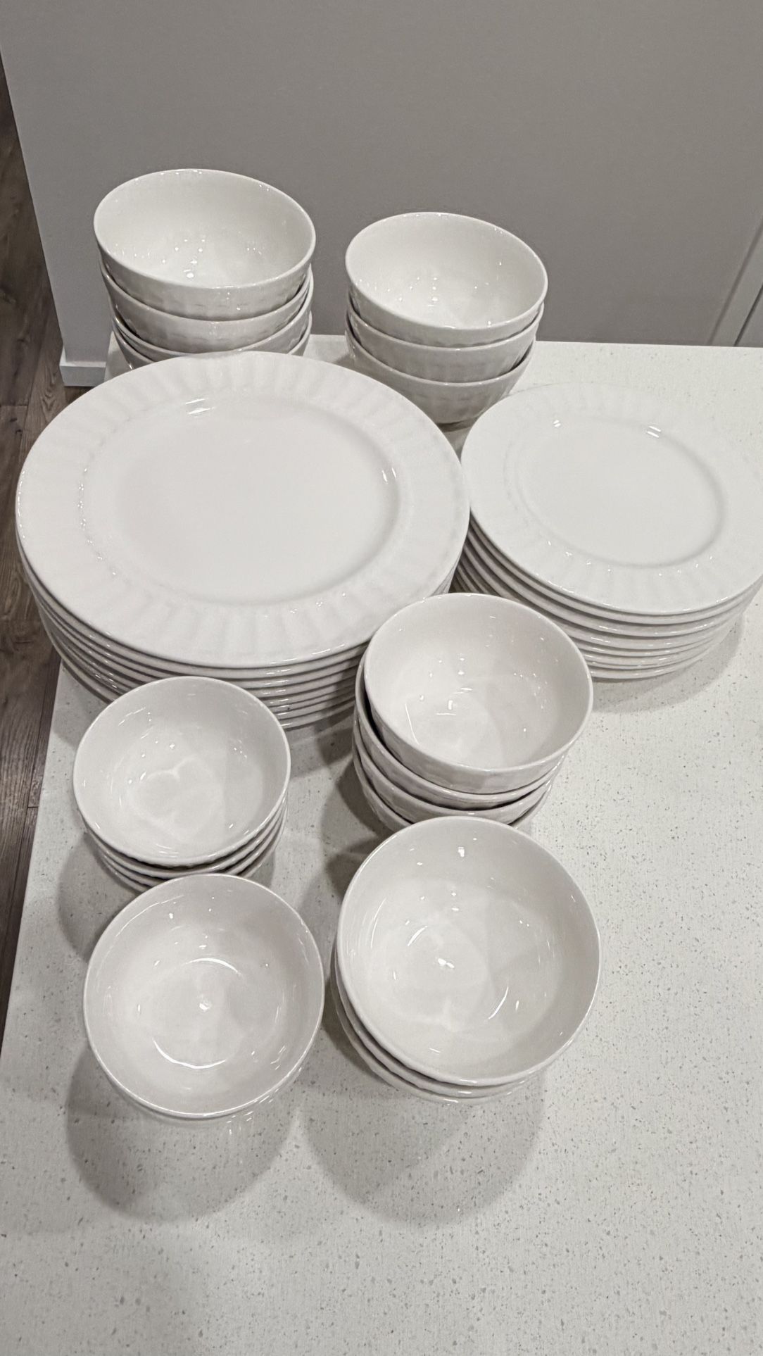 MOVING SALE!! Color- White (Embossed - 35pcs) Material - Porcelain Brand - Gibson Home Pattern - Solid Collection Name - Gracious Dining Occasion - Everyday Service for 7 that includes 7 of each of the following: 10.5" Dinner Plates, 8.5" Dessert Plates, 6" Cereal bowls, 4.5" Bowls, and 4" Bowls. A beautiful set that is also microwave and dishwasher safe. A durable, lightweight, BPA-free, and heat-resistant material made from 100% natural minerals. These qualities allow for a versatile everyday use, while the embossed texture creates an elegant charm and pop to your dining table