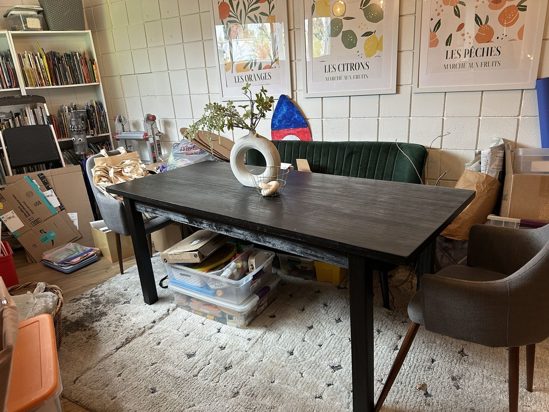 Staff room table. Normal wear and tear. Some paint and glue can be cleaned off. Barely used.