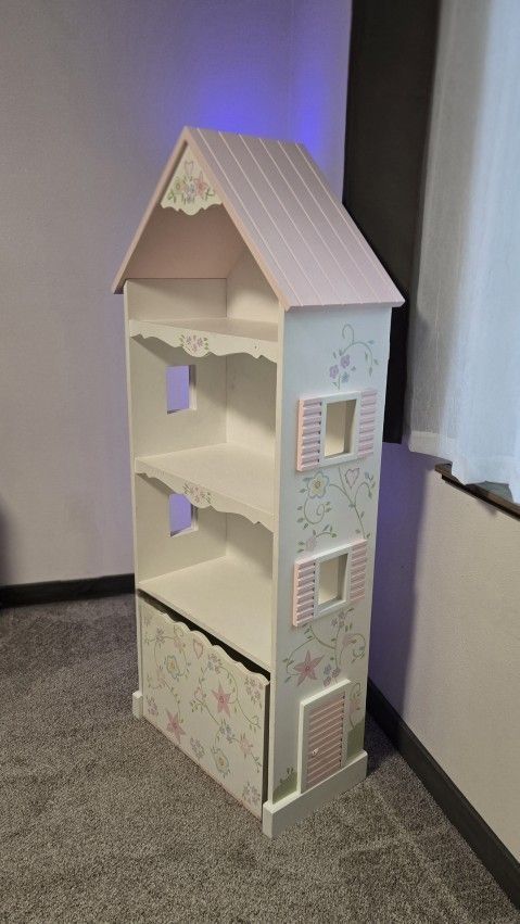 This beautiful cabinet can be used for books, as a doll house, for art storage, etc. The bottom cabinet is on wheels and rolls in and out. Great solid wood construction, from non-smoking home. It has a few little nicks and imperfections if you look closely. Make me an offer.