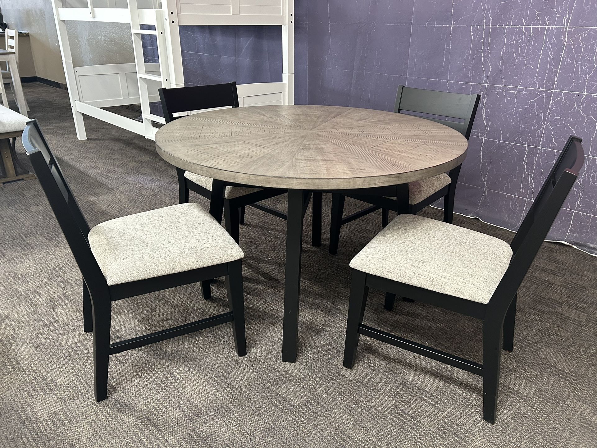Brand new. The set includes a table and 4 chairs . Stain-resistant upholstery on seat cushions 48” diameter Ask about payment plans!