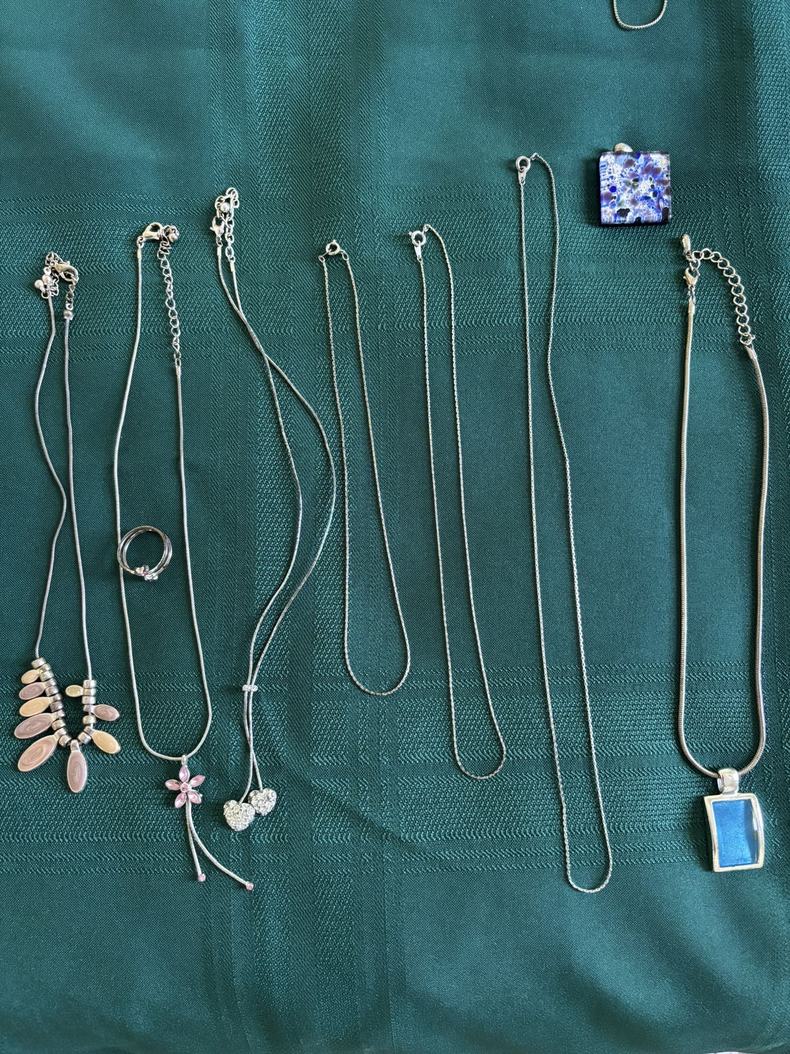 Costume Jewelry Silver Necklaces, lot of 9 pieces, 7 necklaces, 1 matching ring, 1 additional pendant, excellent condition.
