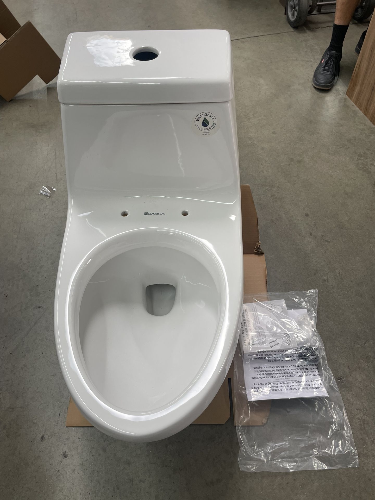 Market price$179 This white one-piece toilet by Glacier Bay occupies minimal space while offering the spaciousness of an elongated bowl. This high-efficiency unit delivers 1.1 GPF for liquid flushes and 1.6 for full flushes, both options easily located at the top-mounted push button. This toilet features integrated tank-to-bowl construction for easy cleaning and its soft lines and sleek curves create an elegant design. While conserving water so you can save on your utility bills, this vitreous china-construction toilet is crack-resistant and includes all necessary installation hardware and a slow-close seat. Low-volume 1.1 GPF flush meets EPA's WaterSense criteria for superb water conservation, equating to more than 20% less fluid per flush Dual-flush option allows users to select 1.1 GPF for liquids or 1.6 GPF for solids Includes white tank cover, elongated slow-close seat with lid, chrome-plated trip levers, wax seal and all hardware necessary for installation Constructed with white vitreous China, which resists fading, cracking and abrasions 16.5 in. bowl height for superior comfort 1-piece design is compact and easy to clean Toilet water supply line sold separately Toilet weighs 80.7 lbs. Lifetime limited warranty WaterSense