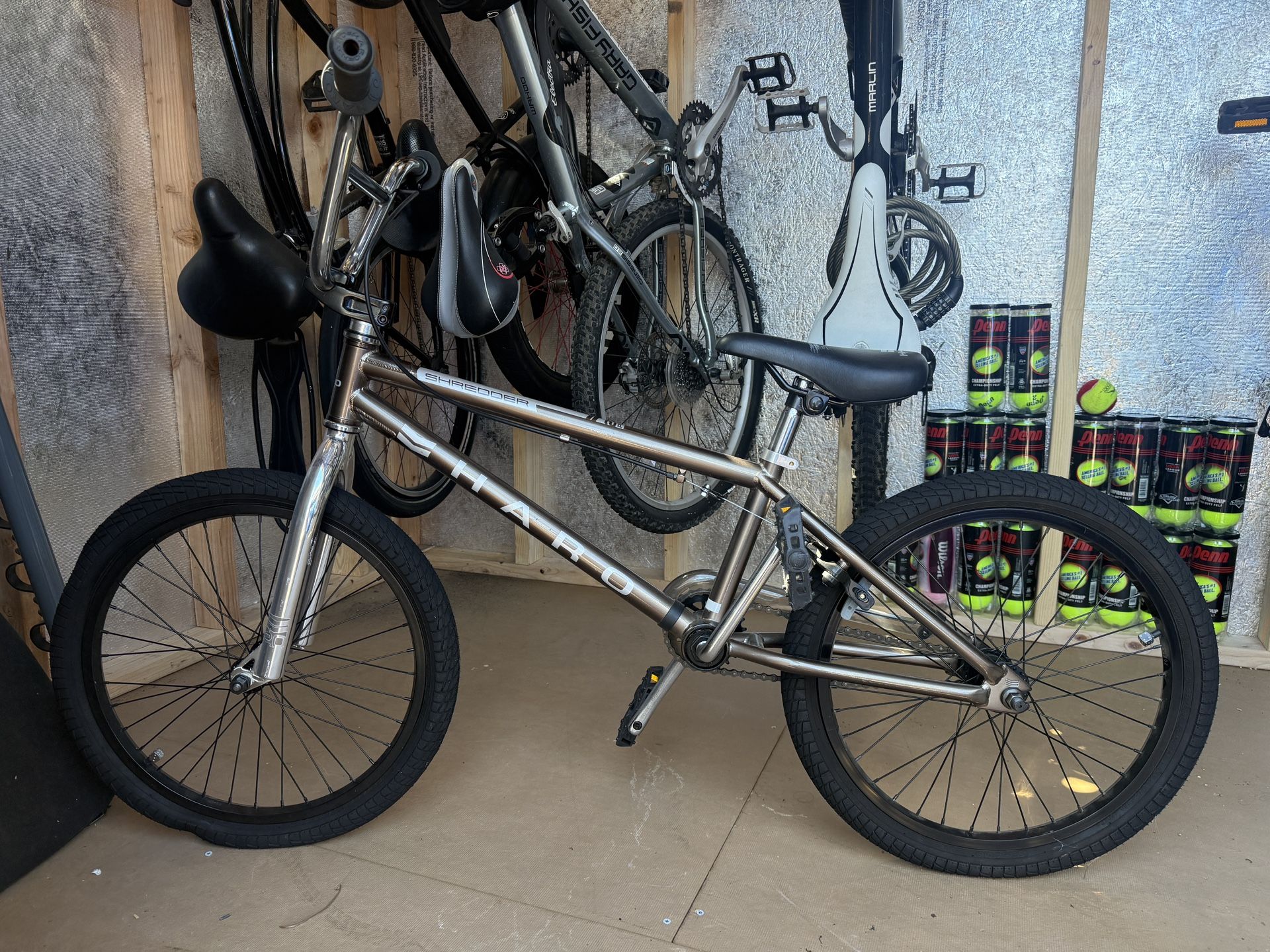 Haro Shredder Pro BMX bike. It features a raw or polished metal finish with the "HARO" name prominently displayed on the frame's down tube and the "SHREDDER" model name on the top tube. Key Specifications & Features Model: Haro Shredder Pro. Frame: Typically features a hi-ten steel frame designed for durability in freestyle and street riding. Wheel Size: This model is commonly available in 20-inch wheel sizes, which is standard for most BMX riders. Design: It includes standard BMX components such as a high-rise handlebar, a padded saddle, and a rear rim brake system.