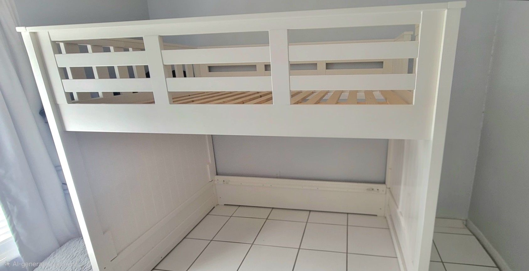 White full bunk bed on top no mattress, bottom full bunk bed not included, can be used as mini office or gaming station.