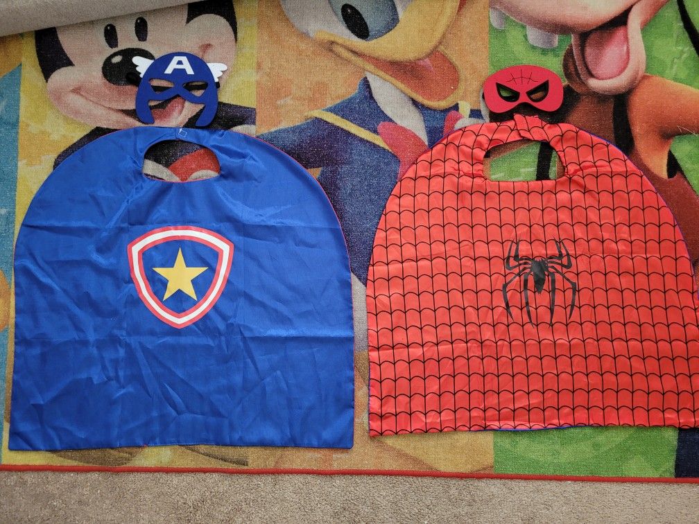 3 capes in total. Includes: Spiderman with mask. The Flash/Captain America cape is reversible with 2 masks. Last cape is also reversible and includes a mask and cufflinks. This cape has a small tear. $10 for all. Location is Fort Apache and Sunset.