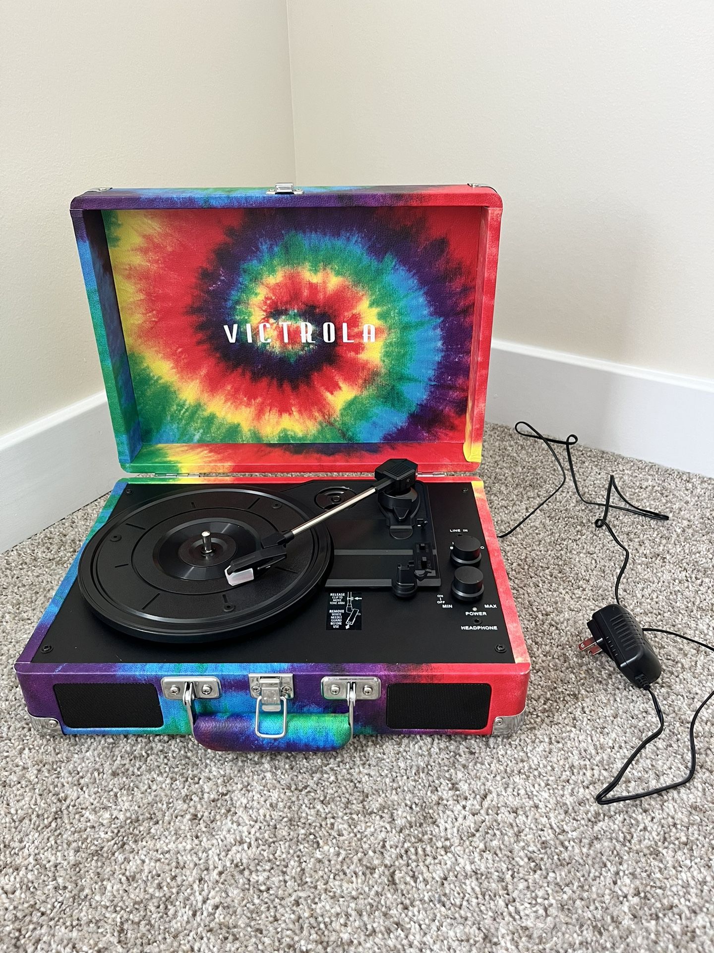 Victrola 3-Speed Portable Suitcase Bluetooth Record Player - Tie Dye/Multicolor Brand new! Never used. The Victrola portable suitcase record players classic design lets you take your tunes anywhere! A portable design with convenient carry handle, 3-speed belt driven turntable and built-in Bluetooth speakers seamlessly play smartphone audio for all to enjoy! Additional features include a custom tuned Pre-Amp for improved audio clarity and bass performance, 3.5mm Aux-In, RCA outputs, and a headphone jack - all great features to enjoy your music at home or on the go!