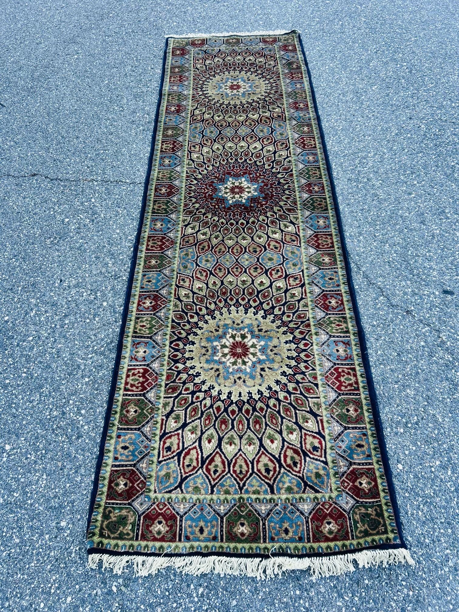 Elegant handmade Afghan runner rug measuring 10 feet by 2 feet 8 inches, showcasing a detailed medallion pattern with vibrant colors including deep red, navy blue, green, and ivory. The rug features intricate geometric and floral motifs that highlight the exceptional craftsmanship of Afghan weavers. Made from fine wool, it has a rich texture and a traditional symmetrical design that brings warmth and sophistication to any hallway or space. The rug shows some signs of wear and minor damage consistent with age, adding a touch of vintage charm. Clean and ready for display. Priced at $750.