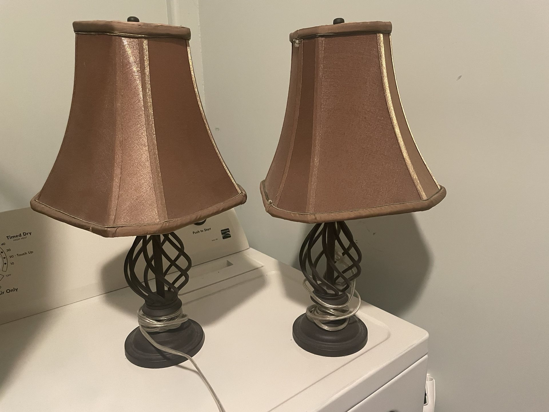Pair of traditional table lamps with metal scroll bases and bell-shaped fabric shades.