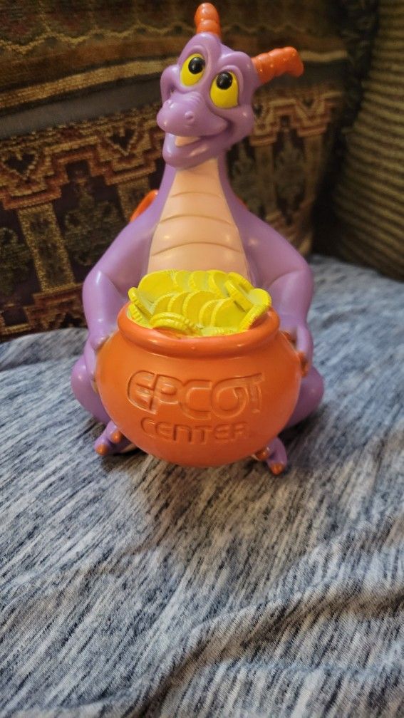 The dragons name is Figmont . He's a coinbank made of plastic/ rubber kinda and came out in 1982 as a Disney character.