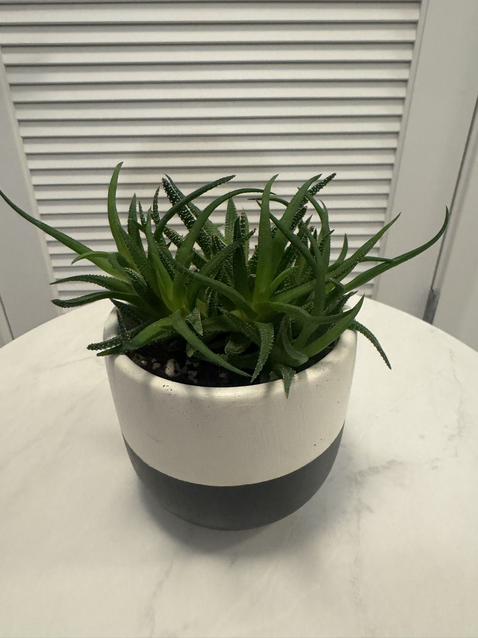 Mid sized Succulent Plant (Haworthia) have had this plant for 5 years! so it's a survivor! Doesn't need much just water about 1 time a week (although i have left it for a month before) and keep near a window. just repotted so you dont even need to repot it for a while! ------------------------- To care for a haworthia, provide bright, indirect light and water only when the soil is completely dry to prevent root rot. Use a well-draining succulent or cactus mix and a pot with drainage holes. During the growing seasons (spring and fall), water more frequently, and reduce watering in winter