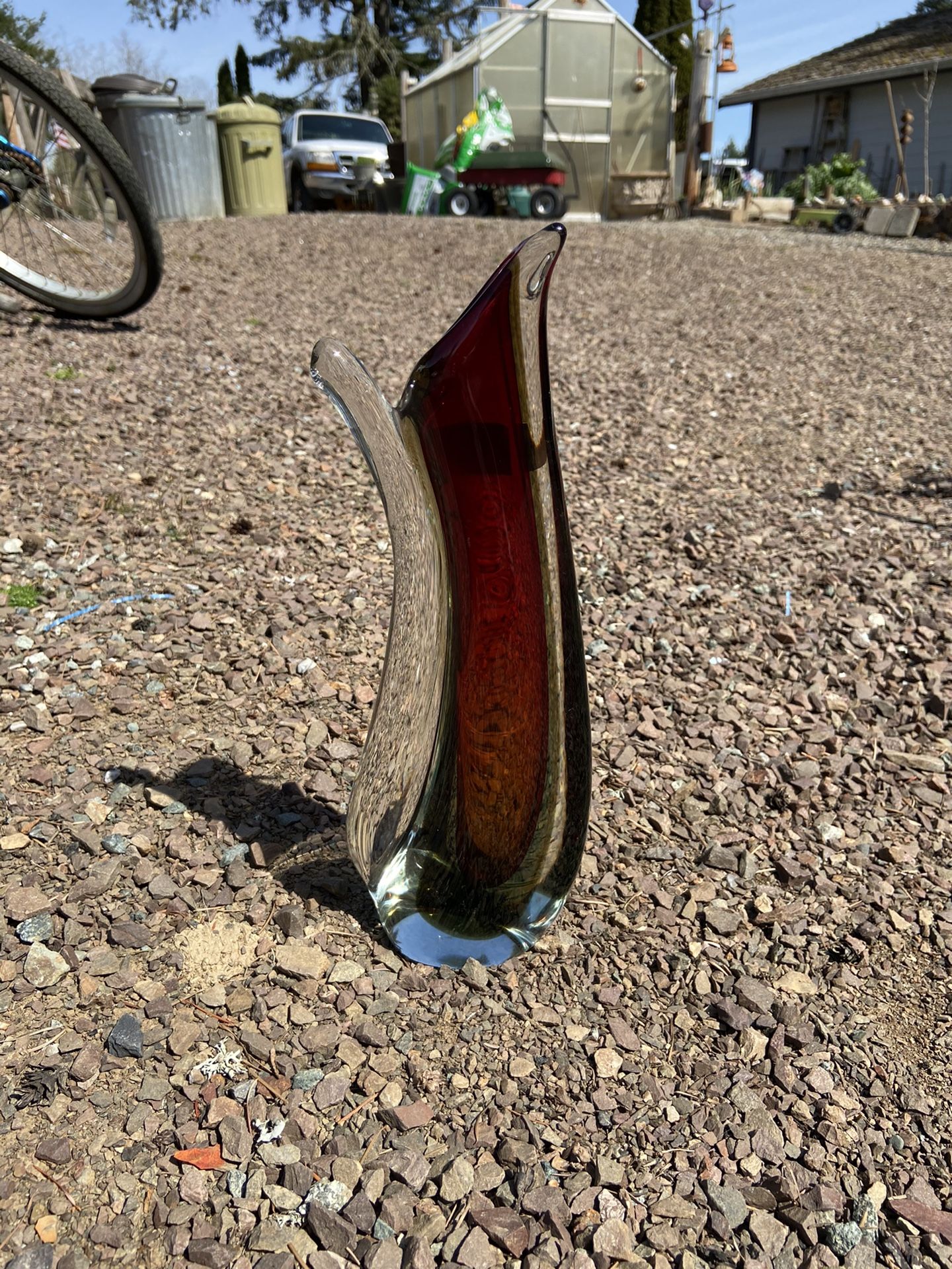 Beautiful thick glass artistic vase. Looks like it is meant for one flower