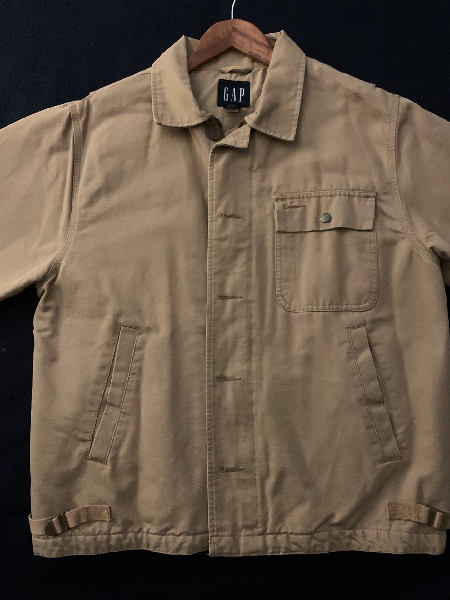 RARELY WORN WORKMAN/CARPENTER JACKET BUTTON UP & ZIPPER VERY GOOD CONDITION Measurements of the coat laid out flat like in the pictures are as follows: Width 23-3/4" Length 29" Sleeve Length 25" (from shoulder seam to end at wrist). It is a medium. Most of my coats and jackets are Large and this one fits me like them