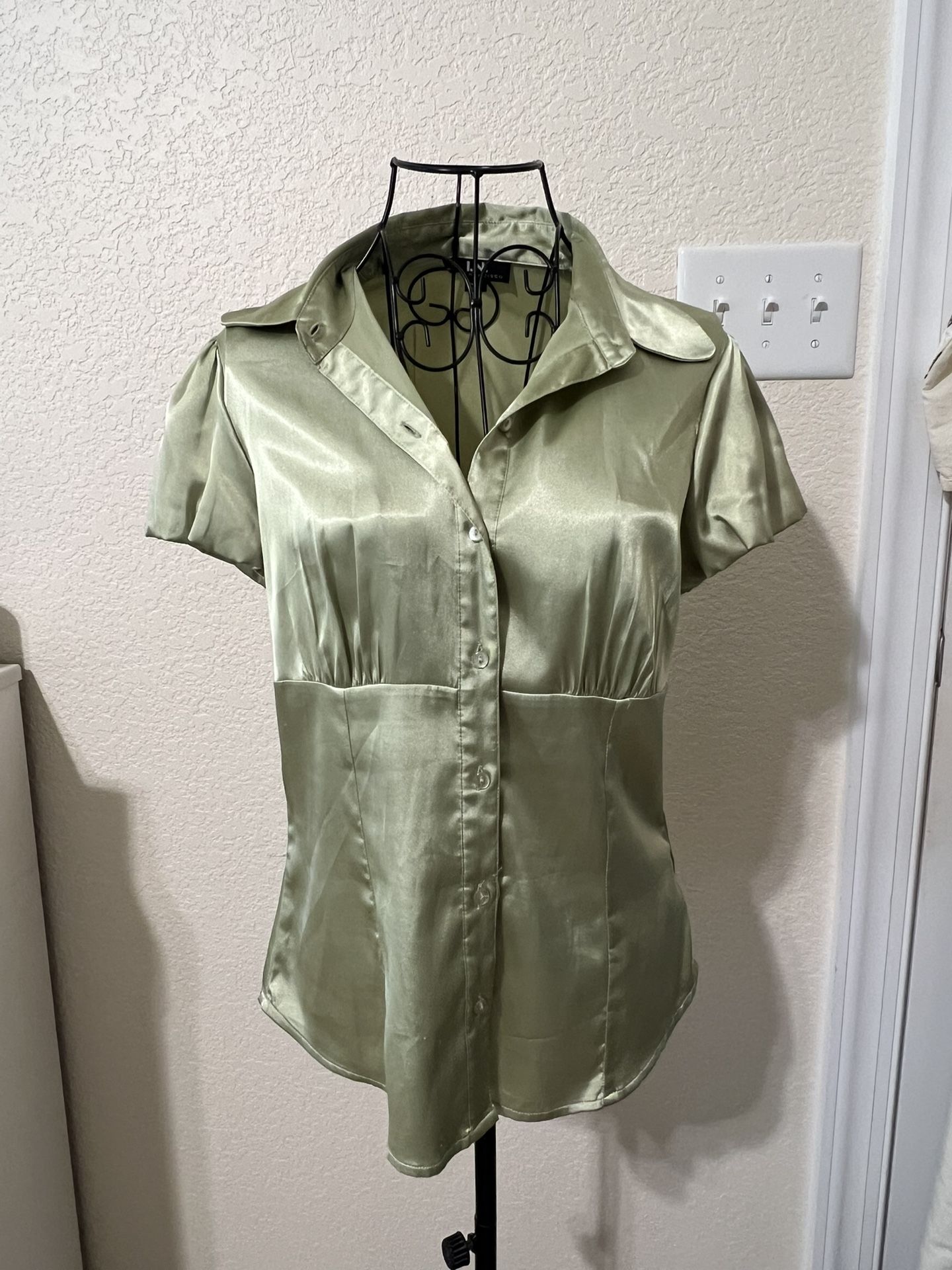 size medium green blouse, very fashionable, i always got compliments every time i wore this (but it’s too small now) y2k, office siren aesthetic, unique piece