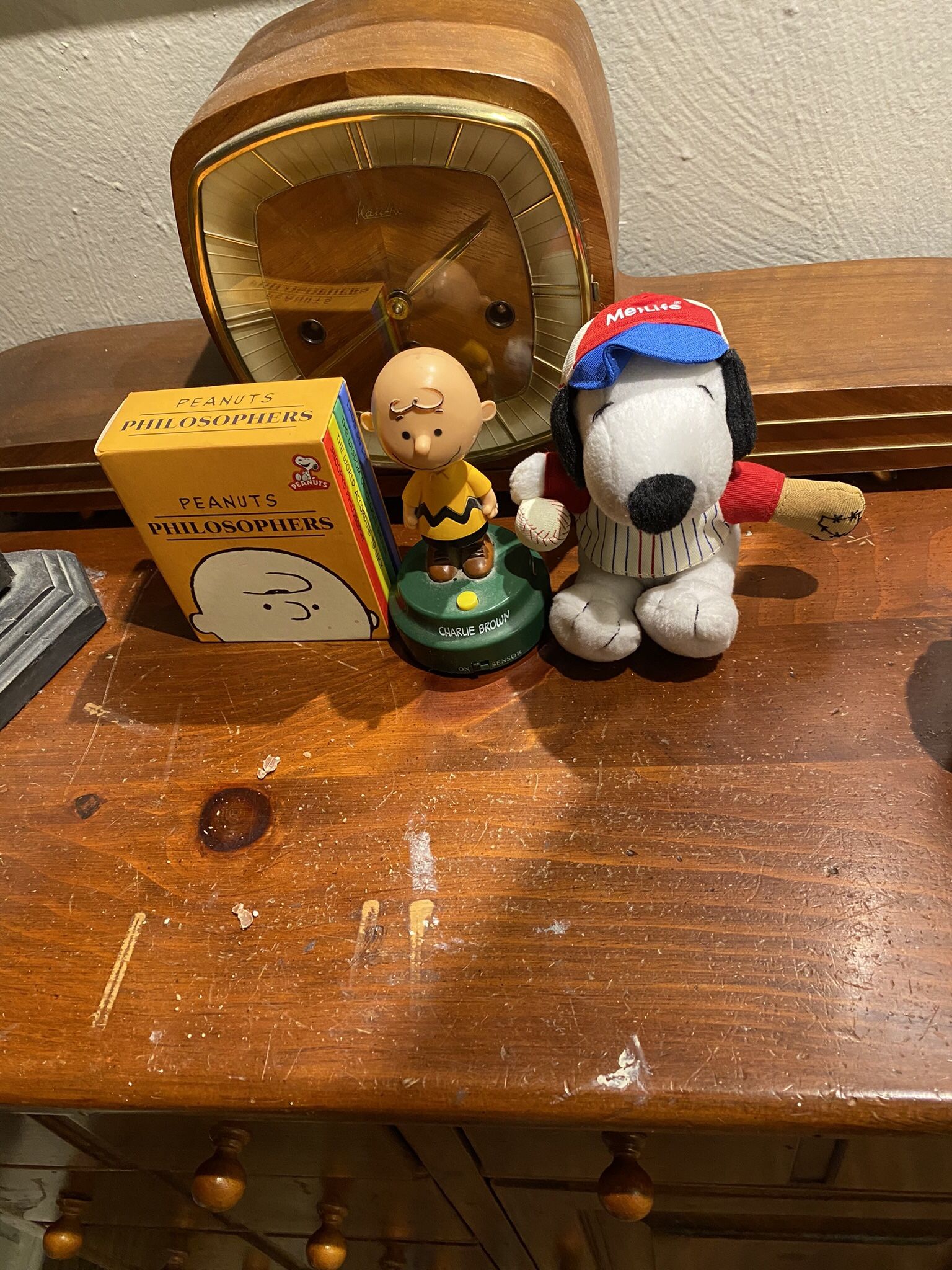 Charlie Brown and Snoopy Collectables. Peanuts Hallmark Philosophers 4 Volume Set of books 20 dollars. Small Plush Snoopy Metlife Beanie Baby 10 dollars. Charlie Brown 6 inch Musical Figure. Plays Snoopy Song 20 dollars