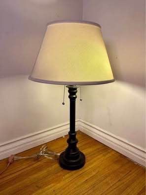 Sells for $150 New Online. Our price $35. Used in good condition. One light does not work. Product Dimensions 17"D x 17"W x 30.5"H Item Weight 5.5 Pounds Lamp Type Table Lamp Shade Color Off-White Shade Material Fabric Classic retro-modern table lamp with graduated-width base Rich bronze finish complements vintage, Mid Century Modern, luxe, and glam home decor White linen shade creates brightly diffused light Suitable for living rooms, home offices, and master bedrooms